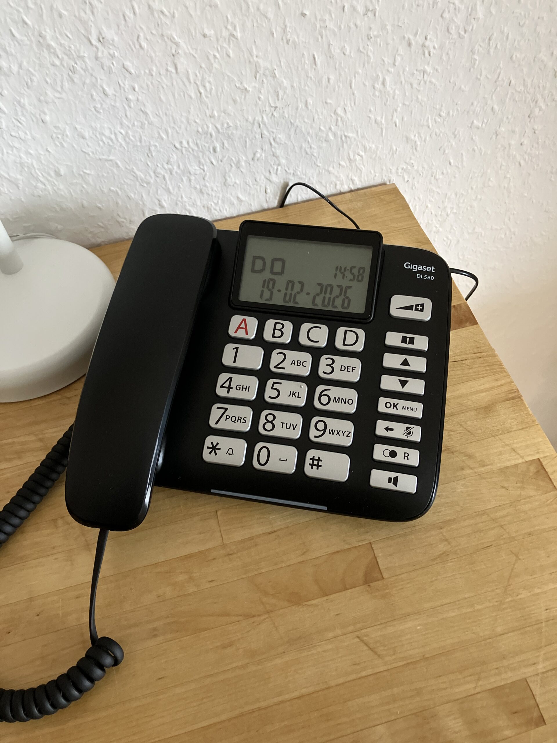 Inzwischen ist das Festnetztelefon da, angeschlossen und es funktioniert tatsÀchlich auch bie mir. Ich verstehe was. Schön altmodisch mit Kabel, da ich damit deutlich besser hören kann als mit schnurlosen Telefonen.